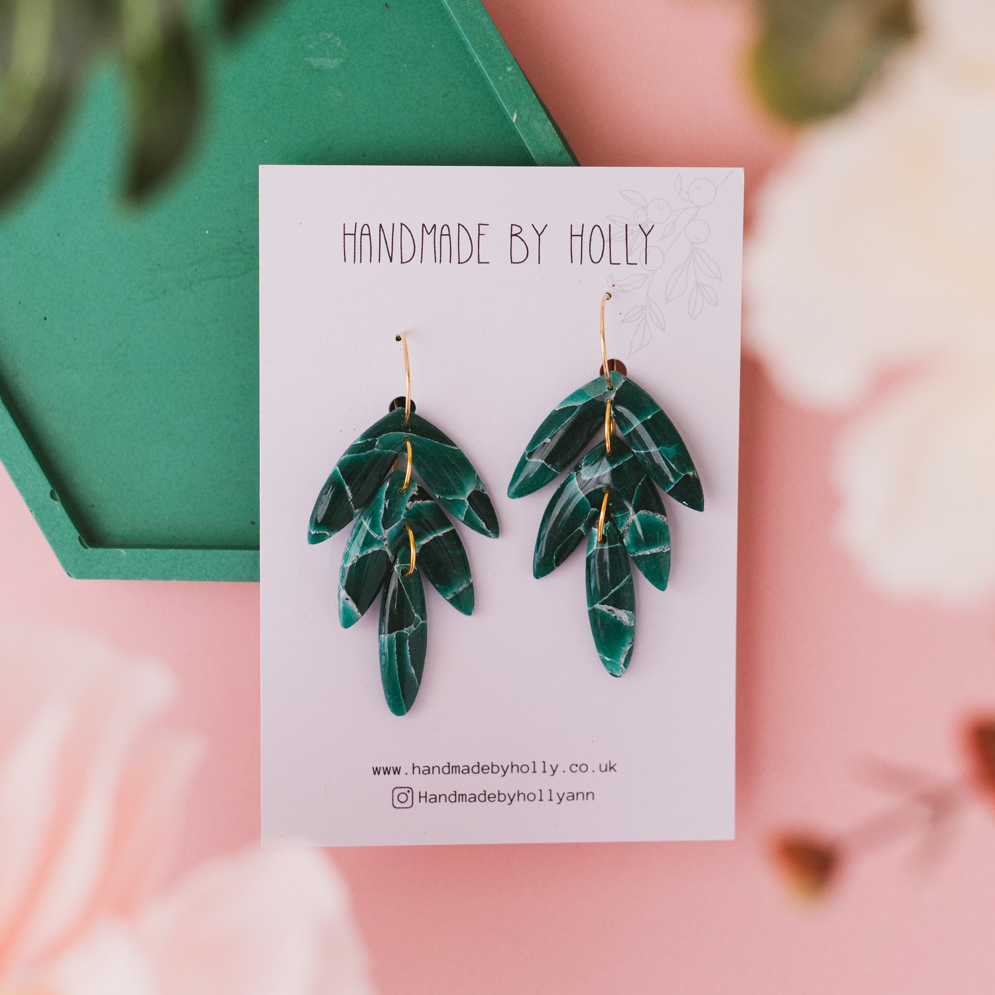 Make a statement with these elegant jade leaf earrings with a gold plated stainless steel hoop. Resined for a beautifully shiny jewel like finish.
